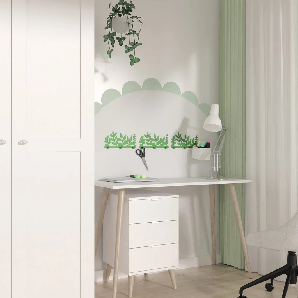 Věšák LISTY v zelené barvě skvěle doplní interiér dětského pokoje.